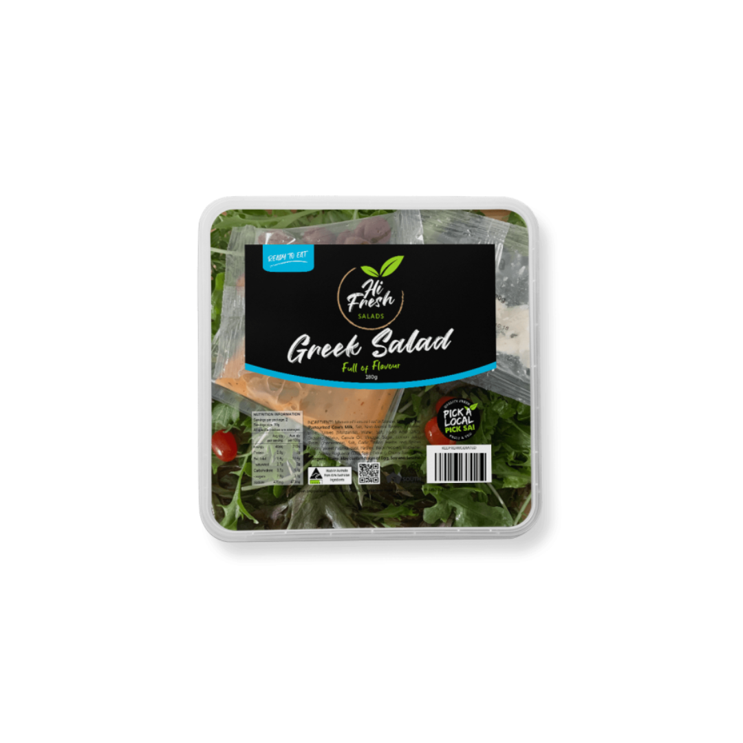 Mixture of lettuce, olives, cherry tomatoes, feta cheese and salad dressing ready-to-go in a 180g bowl